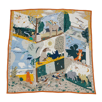HERMES Giant Square Aesop's Fables Size 140 Orange/Green/Blue・Ciel Cashmere70% Silk30%